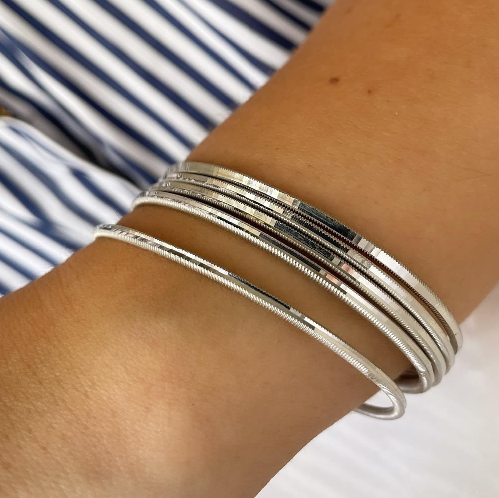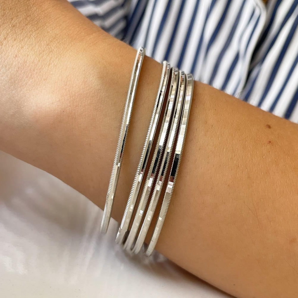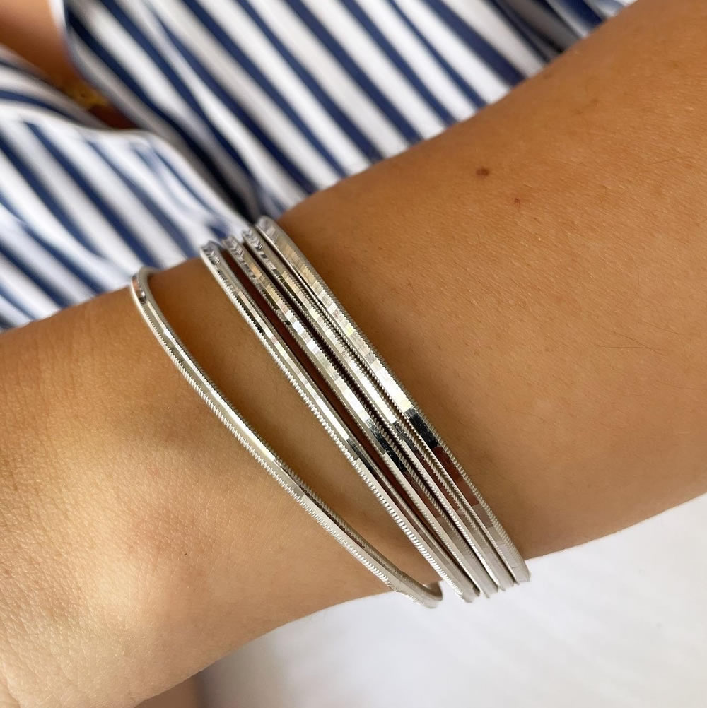 925 ayar saf gümüşten üretilen Gümüş Ajda Bilezik, klasik zarafeti modern çizgilerle birleştiren özel bir takı modelidir. Parlak ve pürüzsüz yüzeyiyle ışığı mükemmel şekilde yansıtırken, çoklu bilezik formu sayesinde sade ama dikkat çekici bir görünüm oluşturur.