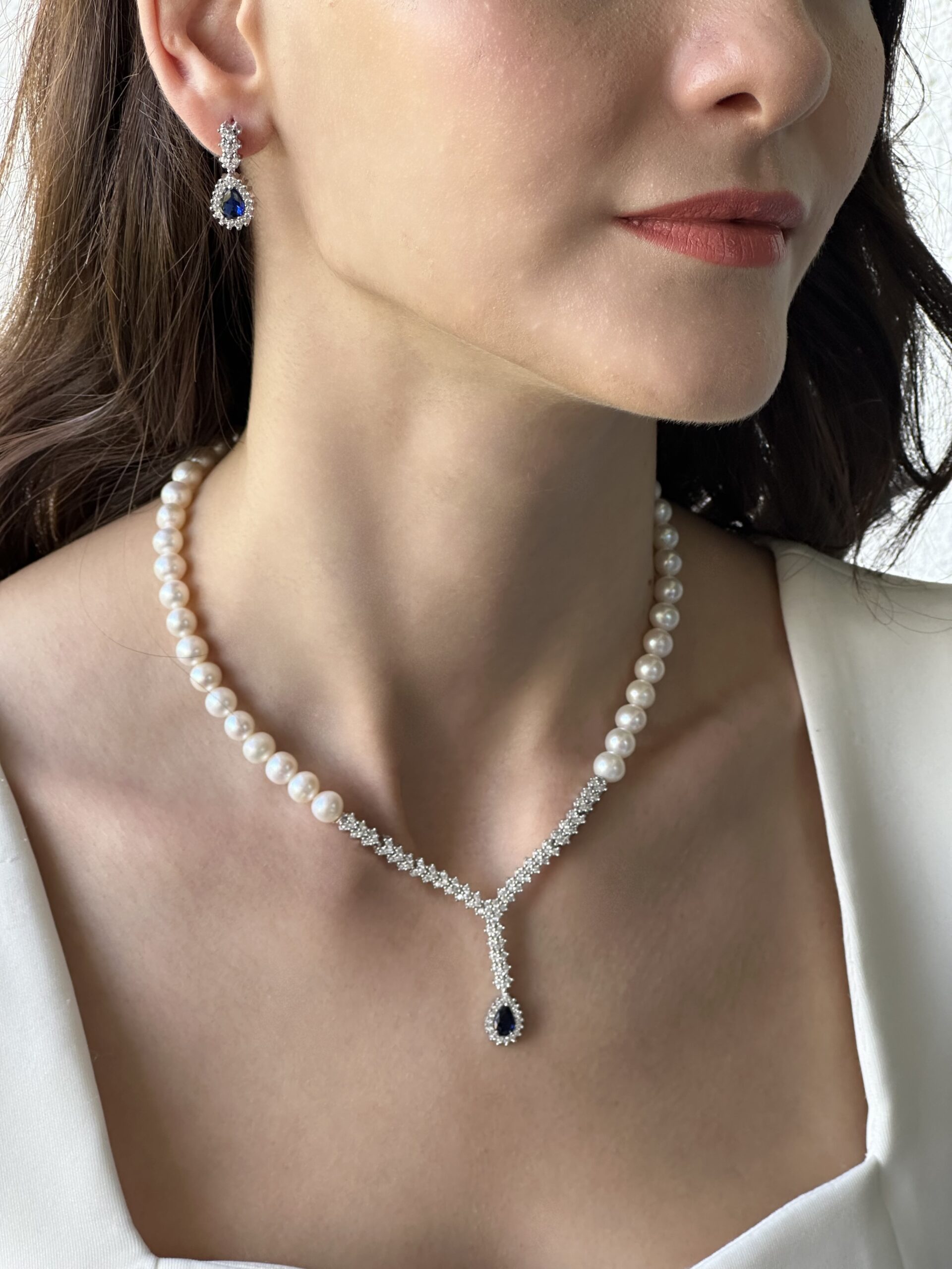 - Safir veya zümrüt ile süslenmiş incili set takı: Geleneksel ve modern unsurların birleşimi.
