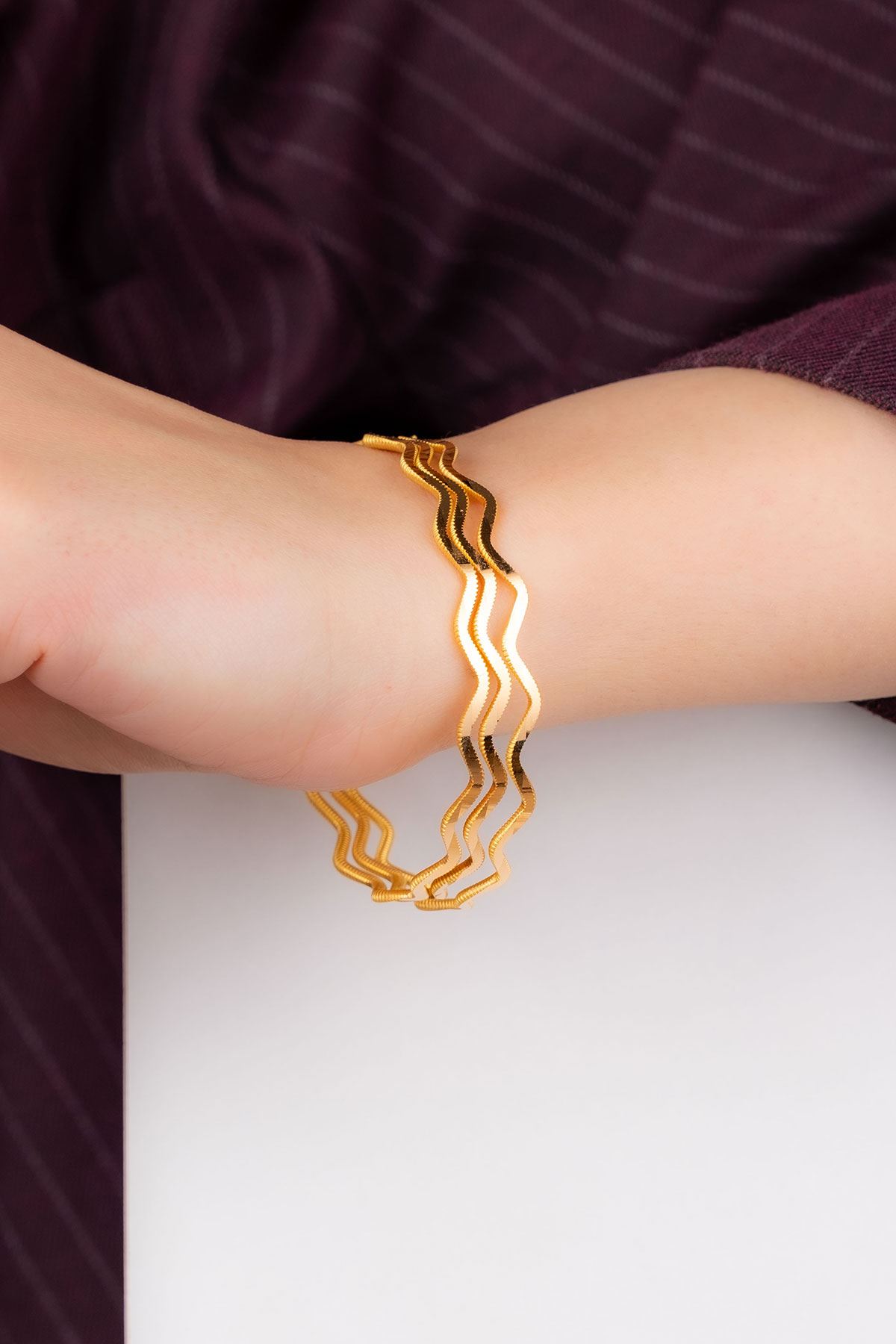 Altın bilezikler, zarafeti ve lüksü simgeler. Hem klasik hem de modern tasarımları ile özel günlerde tercih edilmeye değer. Altın, her türlü kıyafetle uyum sağlayarak zarif bir görünüm sunar. Düğün, nişan veya yıldönümü gibi önemli etkinliklerde, farklı desen ve dokulardaki altın bilezikler göz alıcı bir hava katabilir.